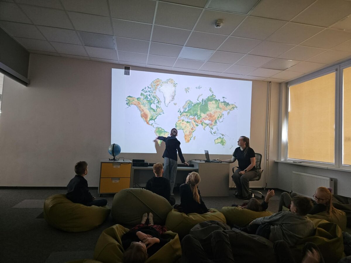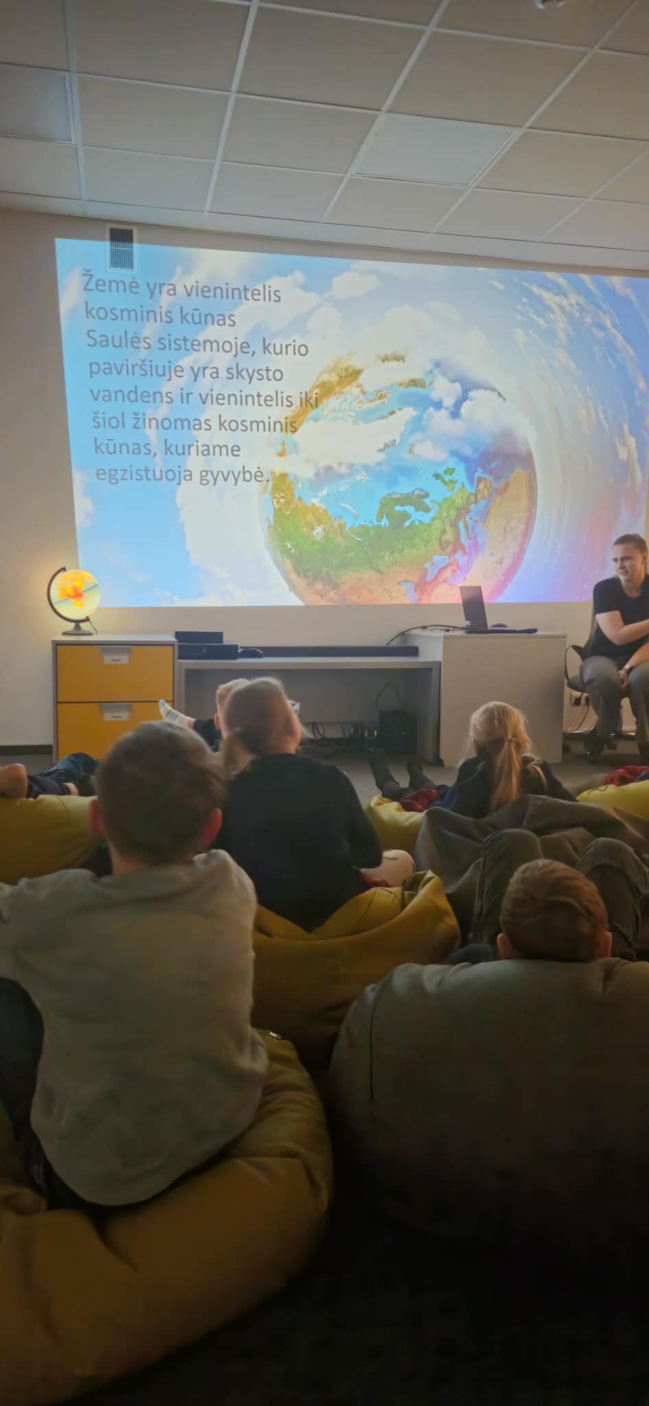 Kovo 24 d. 2b klasės mokiniai su mokytoja aplankė Marijampolės Petro Kriaučiūno biblioteką. Edukacijos metu leidosi į kelionę po mūsų planetą, aiškinosi kaip ir kada atsirado Žemė, kaip joje užsimezgė gyvybė, kokia įdomi ir įvairi mūsų planeta. Diskusijų metu susipažino su pasaulio geografinėmis, biologinėmis ir kultūrinėmis įdomybėmis.