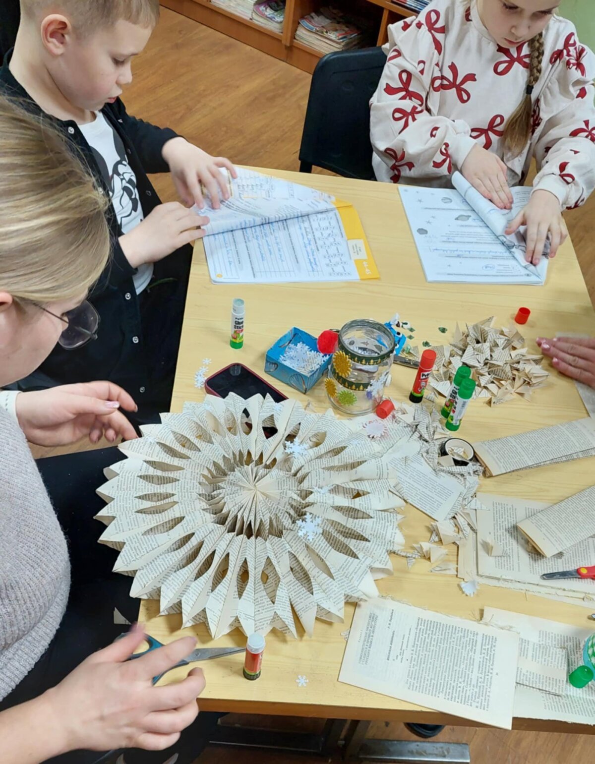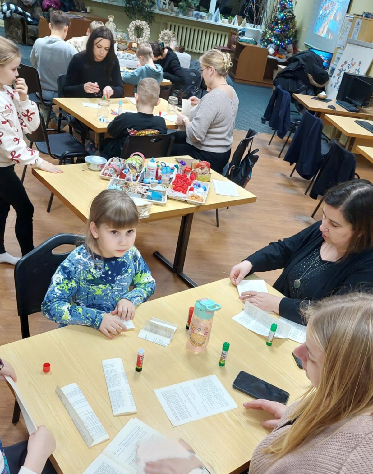 Gruodžio 8 ir 10 d. vakarais progimnazijos bibliotekoje vyko kūrybinės kalėdinės dekoracijos dirbtuvės. Jaukiai pavakaroti ir kūrybingai praleisti laiką susirinkę šeimos kūrė kalėdinius papuošimus iš nebereikalingų knygų puslapių, o mažieji prisigamino žibintų iš stiklainių. Veikla ne tik subūrė bendrystei, laikui su artimu, bet ir praskaidrino niūrius vakarus džiugia kūryba, geromis emocijomis, jaukumu prie arbatos puodelio. Vaikų ištartas ,,norim dar" yra didžiausia paskata susiburti ir vėl kurti. Ačiū atvykusiems!